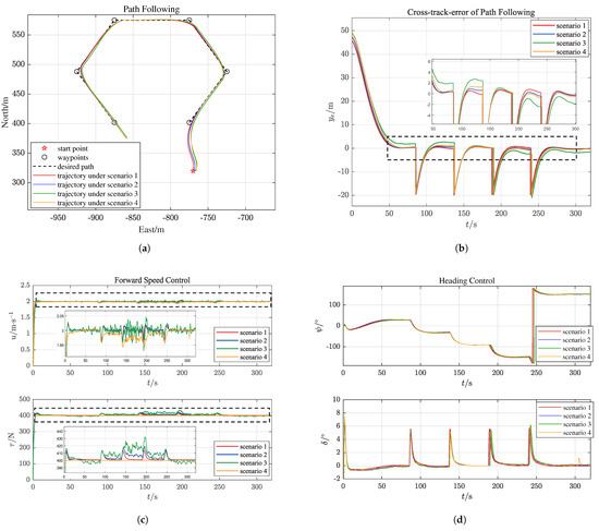Figure 14a shows the trajectory of the WAMV, where the dashed line represents the desired path and the solid line represents the actual trajectory. Figure 14b shows the variation curve of cross-track error. Figure 14c shows the variation curves of surge velocity and thrust. Figure 14d shows the variation curves of yaw angle and azimuth angle. In each figure, the red, blue, green, and yellow lines correspond to the four scenarios mentioned above.
