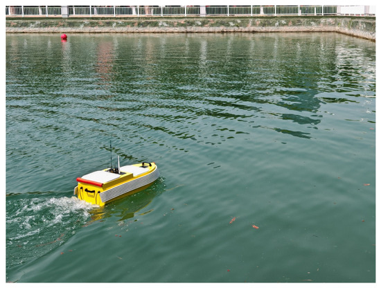 To validate the feasibility of rapid USV development using the proposed simulation system, the “Noah” USV developed by AMOVLab [20] was employed to conduct water tank experiments under the most comprehensive path-following mode. The experimental environment is shown in Figure 15.