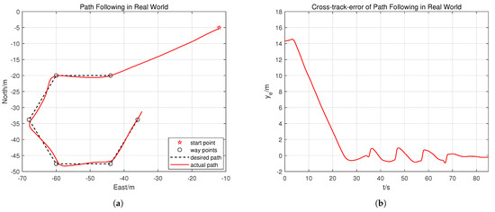 As in Section 5.1.3, the waypoint coordinates were set as P1 (−20, −44), P2 (−20, −60), P3 (−33.8, −68), P4 (−47.6, −60), P5 (−47.6, −44), and P6 (−33.8, −36). The USV’s path-following trajectory and cross-track error curves are shown in Figure 16a and Figure 16b, respectively.