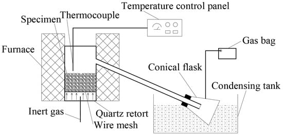 The experimental apparatus used is shown in Figure 1, and the experimental steps are as follows. First, the raw OS (20 g), DMOS + C, or WMOS + C were placed inside a quartz retort (inner diameter of 50 mm and height of 140 mm), respectively. Next, the samples were heated from ambient temperature (30 °C) to the target temperature (400/520 °C) with a heating rate of 10 °C/min by an external heater in an N2 atmosphere and then held for 2 h. The nitrogen flow rate was maintained at 100 mL/min by a flow control device, which could effectively carry the oil and gas products out and avoid the temperature fluctuation caused by heat absorption.