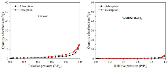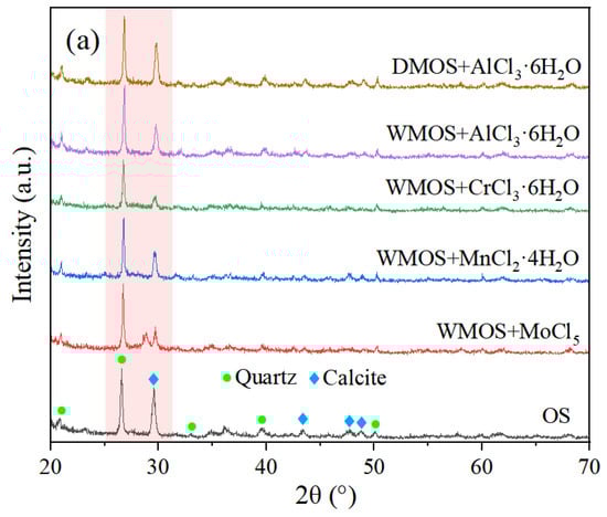 Before the start of the experiment, two mixing methods were used to mix the catalyst with OS, including mechanical dry mixing and wet mixing. The dry-mixed sample was obtained by mixing 2 g of chloride with 20 g of OS powder and then shaking for 10 min in an oscillator, which was recorded as DMOS + C (DMOS + AlCl3·6H2O, DMOS + MnCl2·4H2O, DMOS + CrCl3·6H2O, and DMOS + MoCl5). The wet-mixed sample was obtained by the following steps: First, 40 mL of deionized water was mixed with 2 g of catalyst powder to completely dissolve it. Then, 20 g of OS powder was added to the solution and heated and stirred for 30 min to fully mix. Finally, a wet-mixed sample, denoted as WMOS + C (WMOS + AlCl3·6H2O, WMOS + MnCl2·4H2O, WMOS + CrCl3·6H2O, and WMOS + MoCl5), was obtained by drying the mixed solution at 80 °C for 10 h and then grinding it into powder below 80 mesh.