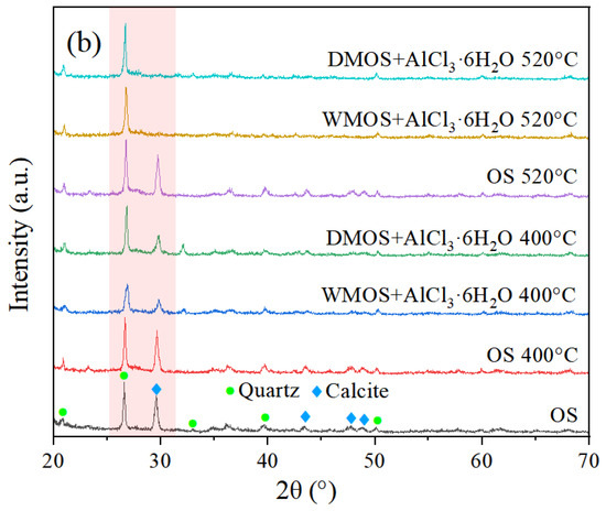 The various residues of different samples after pyrolysis at different temperatures were also analyzed by XRD analysis, as shown in Figure 2b. The results indicated that the calcite in OS remained almost unchanged before and after pyrolysis. However, after pyrolysis at 400 °C, the calcite content in the mixed samples decreased significantly, especially in DMOS + AlCl3·6H2O. Moreover, the calcite in DMOS + AlCl3·6H2O and WMOS + AlCl3·6H2O completely disappeared after pyrolysis at 520 °C. These results indicate that AlCl3·6H2O can effectively react with calcite in the OS matrix during pyrolysis, and the degree of reaction increases with increasing temperature. This may be due to the continuous decomposition of kerogen and release of hydrocarbon products during pyrolysis, where calcite embedded in the kerogen and matrix is continuously exposed and can be more completely consumed.