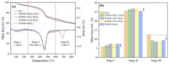 Generally, the TG curve of OS can be divided into three stages. Stage I (<250 °C) consists of the evaporation of water, including the interlayer water of clay minerals. Stage II (250–600 °C) is mainly the pyrolysis of kerogen, while stage III (>600 °C) involves the decomposition of clay minerals including carbonate minerals [7,8]. Figure 3 shows the TG/DTG curves and weight losses at different stages of OS and various mixed samples. As shown in Figure 3, the weight losses in stage I of the mixed sample are increased compared to OS. The catalyst in wet-mixed samples may crystallize during the drying process, releasing a large amount of crystallization water during heating, which mainly leads to an increase in weight loss. Afterwards, the weight losses in stage II of the mixed samples corresponding to MnCl2·4H2O, AlCl3·6H2O, and CrCl3·6H2O also show significant increases compared to OS. According to Figure 2 and Equations (2)–(9), this may be due to the continuous decomposition of calcite in acidic environments and thermal decomposition of the generated substances, mainly MnCO3, Al(OH)3, and Cr2(CO3)2, etc. Finally, Figure 3a shows that the peak in stage III on the DTG curve almost disappeared, and Figure 3b indicates significant reductions in weight loss of the mixed samples compared to OS. This proves that most of the carbonates in the OS have been removed during wet mixing or previous heating processes.