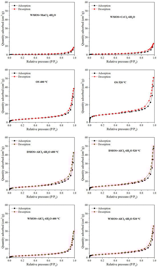 Figure 5 illustrates the specific surface area (SSA) and pore volume (PV) of different samples. Based on this, the corresponding single-point average pore radii of different samples were obtained, as shown in Figure 6. The results indicate that when the oil shale is wet mixed with chlorate, the SSA and PV of the mixed samples undergo a significant decrease, while their average pore radii show an increasing trend. This phenomenon was more obvious when the chlorates were MnCl2·4H2O and MoCl5. These suggest that acidic chlorate can improve the pore space and increase the pore volume inside the matrix by removing carbonate during wet mixing. In addition, the SSA of the mixed samples all decreased after pyrolysis occurred, especially after higher temperature (520 °C) treatments. The changes in PV show a more complex pattern, which may be influenced by the combined effect of kerogen cracking and the reaction of chlorate with minerals in the matrix. Finally, the average pore radii of the pyrolyzed residues via the mixed samples all show an increasing trend compared to the OS residues, showing a significant improvement effect of AlCl3·6H2O on the pore space.