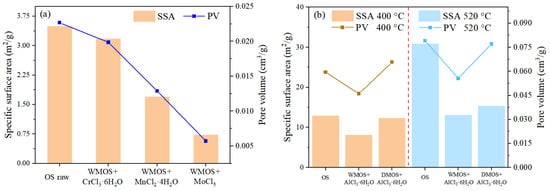 Total BET (Brunauer–Emmett–Teller) specific surface area (SSA) and pore volume (PV) of (a) OS, various mixed samples, and (b) residues.