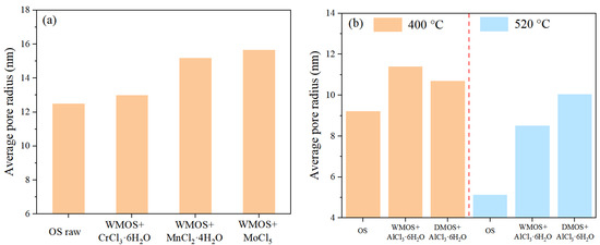 Single-point average pore radius based on BET model for (a) OS, various mixed samples, and (b) residues.