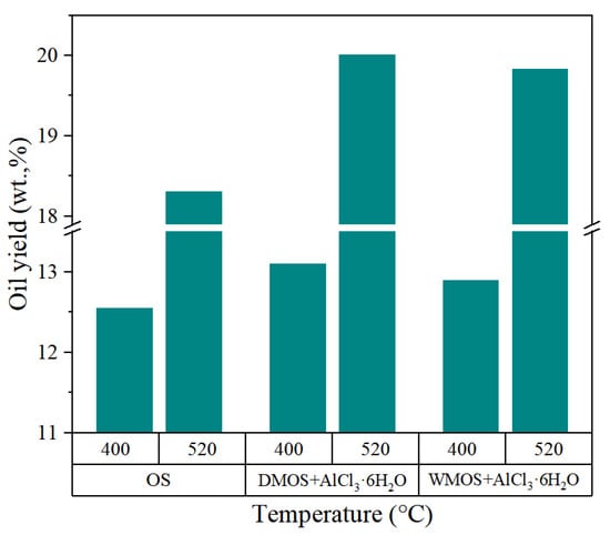 The compositional distribution of the gas products collected after different times at constant temperature in various experiments is shown in Table 2. The results show that AlCl3·6H2O effectively promoted the production of hydrocarbon gas products at 400 °C. While at 520 °C, the addition of AlCl3·6H2O led to an increase in oil products (Figure 7) and an increase in CO2, which resulted in a decrease in the percentage of cracked gas generated at high temperatures. Both at low and high temperatures, the samples obtained by both mixing methods released significant amounts of carbon dioxide during pyrolysis. This suggests that AlCl3·6H2O reacts to a large extent with carbonate minerals during pyrolysis to produce large amounts of CO2. In addition, the DMOS + AlCl3·6H2O sample clearly released more CO2 during pyrolysis, which was caused by its internal carbonate not being consumed during dry mixing. This is consistent with the XRD analysis results.
