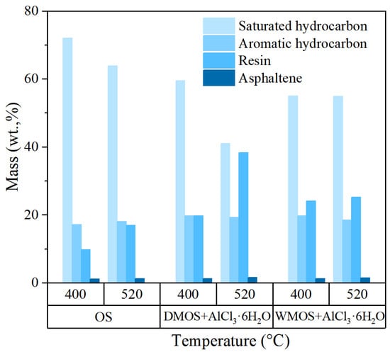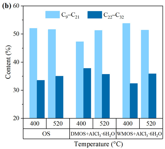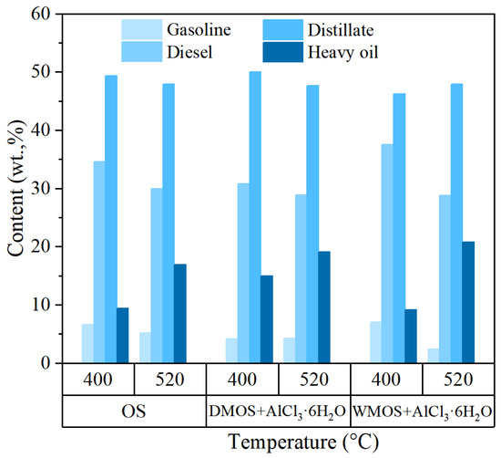 Figure 9 shows the fraction composition results of various shale oil samples. It suggests that the compositions of shale oil obtained via DMOS+AlCl3·6H2O and WMOS + AlCl3·6H2O at 400 °C were remarkably different. The shale oil obtained from DMOS + AlCl3·6H2O contains less gasoline and diesel and more distillate and heavy oil. This happens because a significant amount of carbon dioxide escapes during the pyrolysis of the DMOS+AlCl3·6H2O, promoting the release of the heavy fraction and reducing the level of the light fraction. There is no large amount of carbon dioxide produced from WMOS + AlCl3·6H2O, which prolongs the conversion time of heavy hydrocarbons. After that, the shale oil obtained via DMOS+AlCl3·6H2O and WMOS+ AlCl3·6H2O at 520 °C both have lower gasoline, diesel and distillate, but higher heavy oil than the shale oil obtained from OS. This implies that the significant increase in pore space caused by AlCl3 can greatly enhance the generation and transport of heavy components at high temperatures.