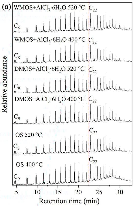 The results show that the shale oil obtained from DMOS + AlCl3·6H2O and WMOS + AlCl3·6H2O at 400 °C have different component distributions. Compared to the shale oil from OS, that obtained from DMOS + AlCl3·6H2O at 400 °C shows a decrease in short- chain hydrocarbons and an increase in long-chain hydrocarbons. In contrast, shale oil obtained from WMOS + AlCl3·6H2O at 400 °C results in an increase in short-chain hydrocarbons and a decrease in long-chain hydrocarbons. These phenomena are similar to the results of the simulated distillation analysis. During the pyrolysis of the DMOS + AlCl3·6H2O, a significant amount of carbon dioxide escaped, promoting the release of the heavy fraction and reducing the light fraction. However, no significant amount of carbon dioxide was produced in WMOS + AlCl3·6H2O, which prolonged the conversion of the heavy hydrocarbons and, together with the catalytic effect of AlCl3·6H2O, resulted in more light fractions. All shale oil samples obtained at 520 °C then have a similar compositional distribution, with fewer lighter fractions as well as more heavy fractions. This suggests that at high temperatures, AlCl3·6H2O can facilitate the initial cracking of kerogen and the release of heavy fractions. This is attributed to the catalytic effect of AlCl3·6H2O and the large amount of pores formed by carbonate removal.
