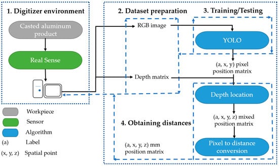 This section presents the elements of the prototype and the algorithms involved in its development, summarized in Figure 1, which illustrates the sequence followed to obtain an output matrix with the labeled spatial location for the main characteristics of an HPDC aluminum product. The subsequent subsections describe the digitizer environment functionality, the hardware and software used, and their central components. The Dataset Preparation Subsection reveals the creation and content of the files derived from the image capture. The RGB-D images taken from the sample that includes HPDC aluminum workpieces have three to four features each (e.g., cast bore, drilled bore, machined flange, screw seat). In the final subsection, the algorithm to obtain distances shows a matrix containing the data (i.e., label, spatial position). The proposal provides an inline decision-making tool for partial verification to know whether or not a piece is within the specified tolerances without using a CMM.