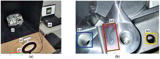 The prototype employs an Asus gaming laptop with an Intel Core I5 processor, an Nvidia GeForce video card, an Ubuntu 22.04.2 LTS operating system, and the Python programming language (a4). On the other hand, the HPDC aluminum parts present different geometrical shapes with several cast bores, which are CNC-machined for a posterior component assembly. Figure 2b depicts the features of a machined workpiece, such as formed threads (b1), the machined flange (b2), and the cast bore (b3).