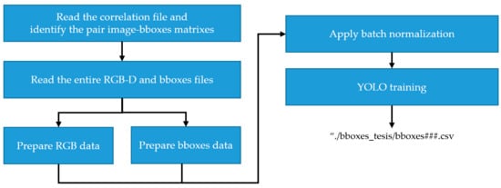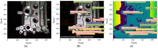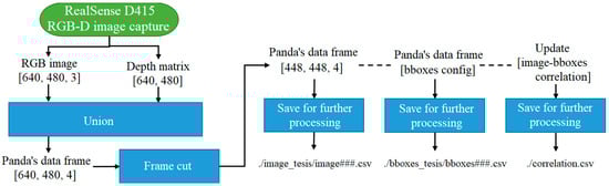 The authors have created a database with images of HPDC aluminum parts based on the workflow depicted in Figure 3. First, the user initializes and configures the RealSense camera to obtain an RGB-D image with a pixel resolution of 640 × 480 and places a casted part on the rotative plate. Next, a data frame stores the information, structured as [[R, G, B, D], [pixel 2], …, [pixel n]]. Then, this data frame is trimmed of its outer parts, reducing its dimensions to 448 × 448 pixels without sacrificing resolution, and three files in CSV format save the data: one contains image information, the other the corresponding configuration of the bounding boxes, and the last the correlation between them. The circular plate rotates a few degrees, restarting the sequence to capture enough images of each casted workpiece. As part of the preprocessing and cleaning task, the user identifies the adequate bounding boxes of each image and labels every feature. Finally, the above files serve as a dataset to train the YOLOv3 and YOLOv11 algorithms.