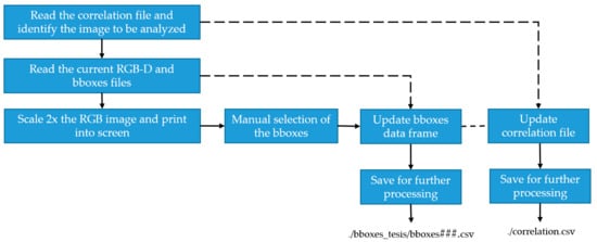 Figure 4 displays the workflow to identify labels and bounding boxes. The user selects the image to be analyzed and scales it to identify the features, picking a box that better fits the feature, pressing the enter key to accept the selection, and repeating these actions with a different feature.