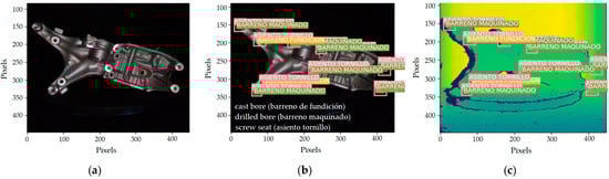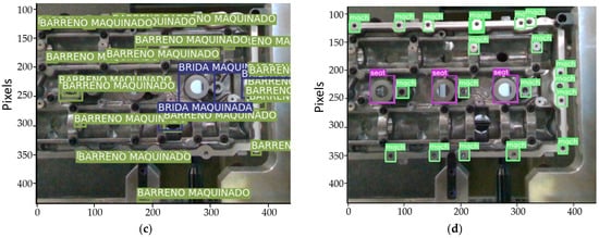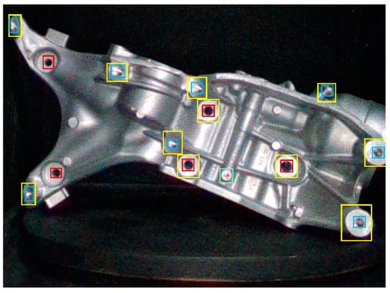 Figure 5 depicts an example of a workpiece with the features’ locations after the user locates the features in the piece identified by bounding boxes. The user interface presents five tags for each bounding box: label, x_center, y_center, width, and height. The label represents a number between 0 and 3 that identifies the feature; x_center and y_center define the geometrical center; and width and height limit the rectangle’s dimensions. The dataset contains 360 images corresponding to 20 workpieces captured in different positions. The resulting image data captured for each piece are normalized to recover the data with the bounding boxes at every scale.
