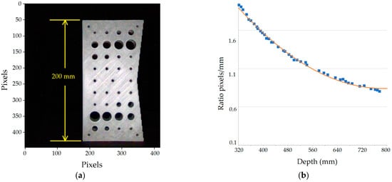 The model outputs feed a polynomial algorithm, observed in Equation (1), that converts pixels into mm using the depth matrix. Figure 7a depicts an aluminum 3D-printed pattern to obtain the indexes by placing it in front of the sensor at 40 different distances. Each iteration builds a matrix and considers a cross-section to locate the initial and final point of the pattern, representing the piece in 200 mm and computing its value in pixels—the distance ratio results from the points at a given depth by dividing them by 200 mm. Figure 7b shows the resulting polynomial behavior.