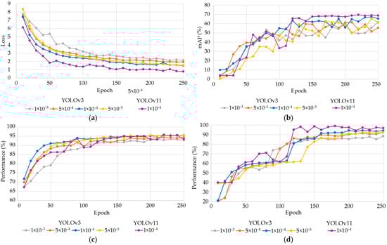 Validation metrics for different learning rate values (1 × 10−3 is gray, 5 × 10−4 is orange, 1 × 10−4 is blue, and 5 × 10−5 is yellow for YOLOv3; and 1 × 10−4 is purple for YOLOv11): (a) loss performance; (b) mAP performance; (c) feature selection accuracy performance; (d) object selection accuracy.