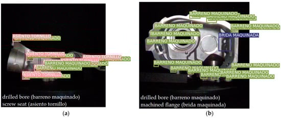 Figure 8b depicts the mAP behavior; the best value is that closest to 100%. YOLOv3 achieves a value of 67%, whereas that of YOLOv11 is 69%. Figure 8c indicates how accurate the algorithm is in identifying features; YOLOv3 attains a value of 95%, whereas that of YOLOv11 is 96%. Figure 8d presents the behavior for object detection, where YOLOv3 reaches a performance of 95%, and YOLOv11 delivers a value of 98%. Table 2 summarizes the performance of the four indicators for each YOLO algorithm, assuming an lr = 1 × 10−4 for both versions, with the best performance at epoch 247 for YOLOv3 and 243 for YOLOv11. Both algorithms locate the features of the HPDC aluminum part. As mentioned, the user interface includes a section that presents some images from the validation dataset, with the prediction outcome, their bounding boxes, and labels (useful for manual validation). Figure 9 illustrates two analyzed images, the bracket and housing pieces, and features (i.e., drilled bore, screw seat, and machined flange), identifying them appropriately with their closest centers.