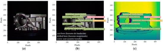 The YOLO algorithms utilize 1000 images corresponding to 20 different workpieces (e.g., housing, bracket, or cover) with three to four features each. The proposal uses data augmentation (i.e., translation, rotation, and horizontal and vertical flip) to reach 50 images for each workpiece. Figure 6 presents the workflow for the training process, and a CSV file stores the information at the end. The algorithms apply three prediction blocks (e.g., big, medium, and small objects) as inputs of a max pool layer that predicts the label of the feature, the center point of the feature (x, y), and the width and height of the bounding box. For YOLOv3 and YOLOv11, the parameters used in the proposed prototype are a batch size of 4, image size of 448, number of features of 4, and learning rate of 1 × 10−4. Since the prototype is employed in Mexico, Table 1 shows a Spanish to English translation.
