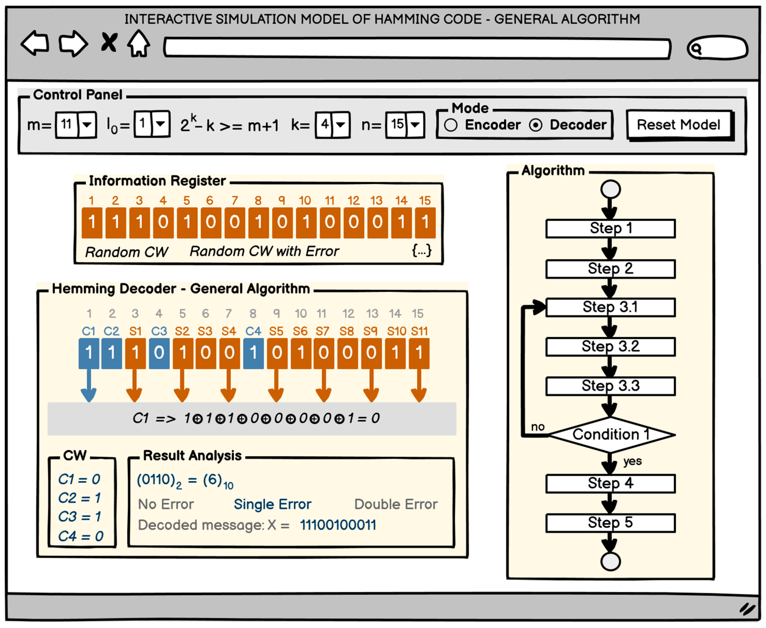 - Defining the sequence of steps that will lead users through the process of solving problems with the Hamming code. It could include instructions for calculating check bits, error detection, and presentation of the result.