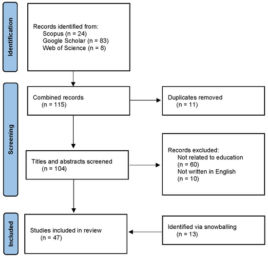 - Wollny, S.; Schneider, J.; Di Mitri, D.; Weidlich, J.; Rittberger, M.; Drachsler, H. Are We There Yet?—A Systematic Literature Review on Chatbots in Education. Front. Artif. Intell. 2021, 4, 654924. [Google Scholar] [CrossRef]
