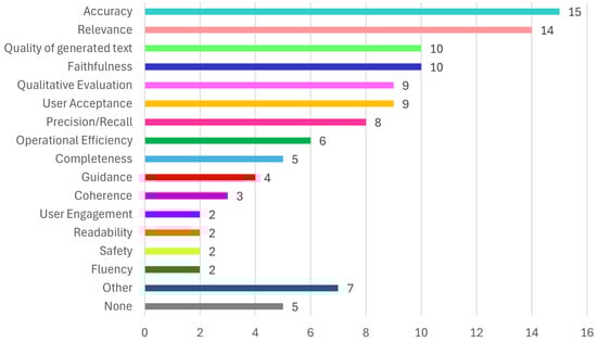 - Because chatbots are made for conversation, we have examples of evaluation based on conversational quality measures, in particular based on Grice’s Maxims of Conversation [68], such as Correctness (assessing whether the chatbot’s answer is factually correct), Completeness (assessing whether the answer includes all relevant facts and information), and Communication (assessing whether the answer is clear and concise) [32], or (in Wölfel et al.’s interpretation) Information Quantity (assessing whether the provided amount of information is neither too much nor too little), Relevance (assessing whether the answer is pertinent to the ongoing topic or the context of the conversation), Clarity (assessing whether the answer is clear, concise, and in order), and Credibility (assessing whether the recipient trusts the chatbot) [53]; these could be used for, e.g., comparing the users’ trust in the answers generated with the help of different LLMs that can power the RAG chatbots (e.g., Wölfel et al. compared the trust level between two versions of GPT: 3.5 and 4.0 [69], and reported 5.50 for answers generated by GPT 3.5 and of 5.59 for answers generated by GPT 4.0 [53]), but also the change in the users’ trust due to incorporating RAG—interestingly and unexpectedly, the same source reports a decrease in the average trust level for answers generated by both GPT 3.5 (from 5.98 to 5.50) and GPT 4.0 (from 6.34 to 5.59) after combining them with the content extracted from lecture slides and their transcripts [53];