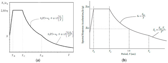 In Eurocode 8 [57], seismic action is specified for a reference exceedance probability of 10% in 50 years, which translates to a return period of 475 years. This value can be adjusted using the importance factor () to reflect the importance classification of structures. The peak ground acceleration (PGA) serves as the reference seismic intensity, also associated with an exceedance probability of 10% in 50 years. The importance factor is similarly based on a reference return period of 475 years, ensuring that structures are designed to meet the no-collapse requirement, meaning they should not experience either local or total failure under the design seismic action. The shape of the elastic response spectrum defined in Eurocode 8 is illustrated in Figure 3a.