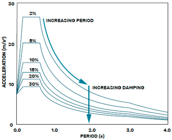 Moving from the seismic coefficient ( in Equation (1)), the response spectrum from the Costa Rican Seismic Code (CSCR-10) [64] is represented on a logarithmic scale in Figure 2. While the formulation and description of the response spectrum in CSCR-10 differ from those presented in ASCE/SEI 7-22 [58] and Eurocode 8 [57], the fundamental concept remains the same. However, significant differences exist in how these standards define the elastic response spectrum, particularly in terms of reference return periods and the anchoring of spectral ordinates used for the computation of the design spectrum. As discussed in [1,2,66], these variations stem primarily from the different approaches adopted by each standard in defining seismic hazard levels.