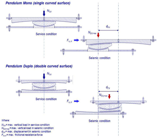 This study focuses primarily on single FPIs. However, it is important to note that the kinematic behavior of both single and double friction pendulum systems is essentially equivalent. The single pendulum (Figure 5) consists of a single sliding surface that provides lateral flexibility and energy dissipation through friction, with the restoring force governed by the curvature of the sliding surface. In contrast, the double pendulum (Figure 5) includes an internal articulated slider mechanism that allows for two sequential sliding surfaces, enabling greater displacement capacity and more complex hysteretic behavior. While the two systems differ in complexity and performance characteristics, their kinematic behavior is fundamentally equivalent, particularly under the assumptions adopted in the equivalent linear analysis applied in this research.