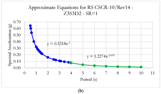 Response spectrum from CSCR-10 for ZIII-S3-D2 and SR = 1 (a); and approximate equations in velocity constant and displacement constant regions for the RS-CSCR-10-ZIII-S3-D2-SR = 1 (b).