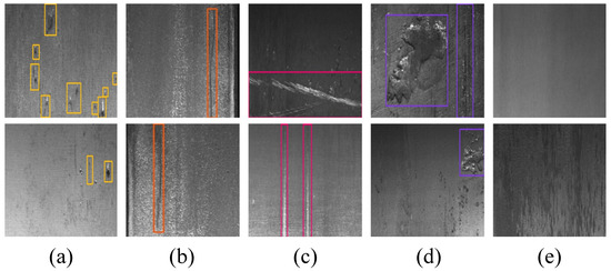 Figure 1. Dataset samples of classified shapes with defects: (a) pitted surface, (b) crazing, (c) scratches, (d) patches, (e) non-defect [21].