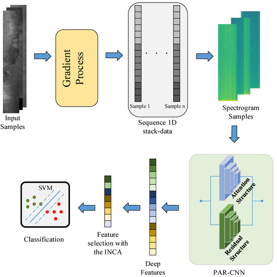Defect detection is still challenging to apply in reality because the goal of the entire classification assignment is to identify the exact type and location of every problem in an image. Since defect detection is a task that includes location and categorization, it is difficult to take both accuracy factors into account when designing related solutions. Flaw detection deployment requires a unique detection dataset that is accurately annotated. Producing steel free of flaws is crucial, particularly in large production systems. Thus, in this study, we proposed a novel deep learning-based flaw detection system with an industrial focus on automated steel surface defect identification. To create processed images from raw steel surface images, a novel method was applied. A new deep learning model called the Parallel Attention–Residual CNN (PARC) model was constructed to extract deep features concurrently by training residual structures and attention. The Iterative Neighborhood Component Analysis (INCA) technique was chosen for distinguishing features to lower the computational cost. The classification assessed the SVM method using a convincing dataset (Severstal: Steel Defect Detection). The accuracy in both the binary and multi-class classification tests was above 90%. Moreover, using the same dataset, the suggested model was contrasted with pre-existing models.