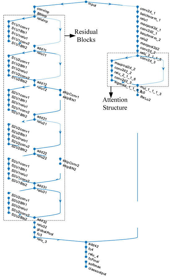 In the second stage, the processed spectrogram images are used to train a newly designed architecture known as the Parallel Attention–Residual CNN (PARC) model. Figure 3 shows the layer connections of the PARC model. The innovation in this model lies in its dual use of attention and residual mechanisms within a customized CNN framework, operating in parallel. Attention mechanisms focus on emphasizing critical areas within the image, while residual connections allow the preservation of feature information from earlier layers by passing it forward to subsequent layers. This synergy ensures that vital details, which may have otherwise been diminished or lost in deep layers, are retained and utilized, thus improving the learning capability of the network. While state-of-the-art architectures such as Swin Transformer, EfficientNetV2, and YOLOv7 have demonstrated remarkable performance across a variety of vision tasks, they are primarily designed as general-purpose models and often involve high computational costs and large parameter counts. In contrast, the proposed PARC (Parallel Attention and Residual Convolution) model is specifically tailored for steel surface defect recognition, focusing on enhancing subtle and fine-grained texture variations that are commonly present in such industrial inspection tasks. The parallel integration of attention and residual mechanisms in PARC enables it to capture both local defect features and global structural information more effectively, without significantly increasing the computational complexity. Compared to Transformer-based models like Swin Transformer, which require large datasets and extensive training resources to generalize well, PARC achieves a competitive or superior accuracy with a lightweight and task-optimized architecture. Furthermore, unlike YOLOv7, which is object-detection-focused and might exhibit overkill or be less efficient for fine-grained classification tasks, PARC offers a better balance between precision, speed, and model complexity. Its compact design makes it more suitable for real-time deployment in edge environments commonly found in industrial inspection systems. Detailed layer information of the PARC model is given in Table A1 in the Appendix A section.