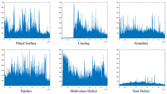 The graph showing the change in 1D stack data with the gradient applied for each class is presented in Figure 4. As observed in this figure, the gradient operation yields different amplitude values depending on the type of surface defect. Particularly in the non-defect class, the gradient output values are minimal, indicating little change across the dataset for this class.