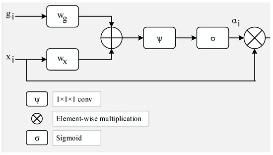 Figure 6 represents the attention module utilized in this research. The gating signal vector, symbolized by g i   , has a wider scale at the feature map of output for ith layer “( x i )”, determining the focus region for each pixel [37]. Equations (3) and (4) give a computed output by applying element-wise multiplication.