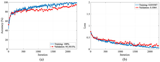 Figure 8. Accuracy and loss graphs of the PARC model during the training process for multi–class classification: (a) accuracy graph, (b) loss graph.
