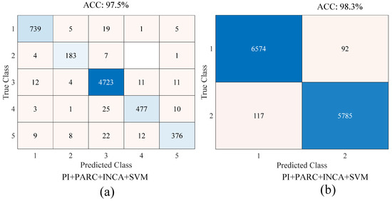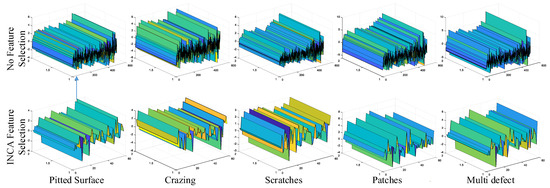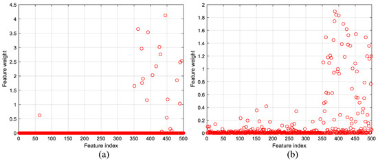 By using learnable parameters and input data, the extraction of five hundred deep features was performed by “fc4”, which is a fully connected layer in PARC. Therefore, the SVM algorithm could be used for the classification task instead of the softmax classifier. The Iterative Neighborhood Component Analysis (INCA) algorithm selected the most distinctive features and the computational cost decreased the execution time of the SVM classifier code. The number of the nearest neighbor (hyperparameter) was chosen as 10 (default value). Figure 9 shows the computed feature weights for each feature index. The threshold weights for the features to be selected with the INCA algorithm are set to 0.5 and 0.2 for binary and multi-class classification, respectively.