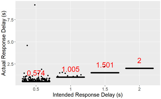 The jitter plot of the actual response delay. The red digits show the average delay.