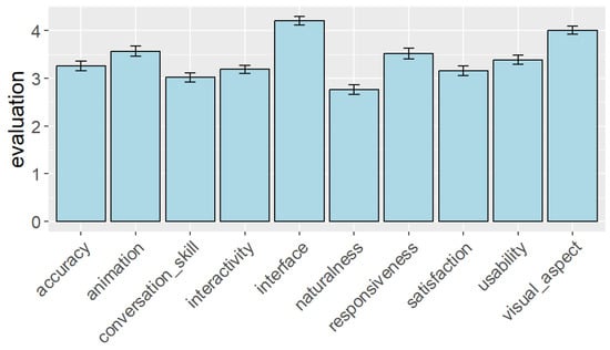 The questionnaire for evaluating the conversation was developed after the chatbot evaluation criteria by Peras [51], where the criteria for evaluating the ECA were separated into 14 categories: user experience [usability, performance, affect, satisfaction], information retrieval [accuracy, accessibility, efficiency], linguistic [quality, quantity, relation, manner, grammatical accuracy], technology [humanity], and business value. We removed the items related to the answer generation system (robustness of the agent, grammatical accuracy, accessibility, linguistic) because a set of answers was manually crafted. We also removed questions related to business value because they were irrelevant to this study. In addition, the naturalness aspect of the agent was divided into the visual and verbal aspects of the agent.