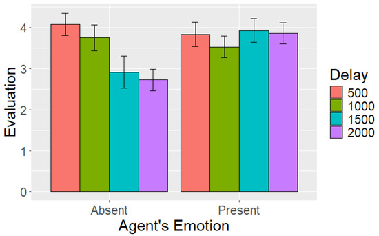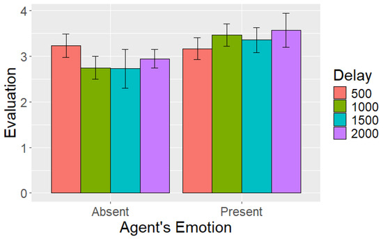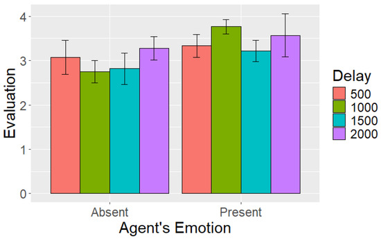 Evaluation results of “satisfaction” with and without the agent’s emotional expression. The error bars indicate the standard error. The effect of emotional expression was statistically significant (p = 0.027), but that of response delay was not (p = 0.938).