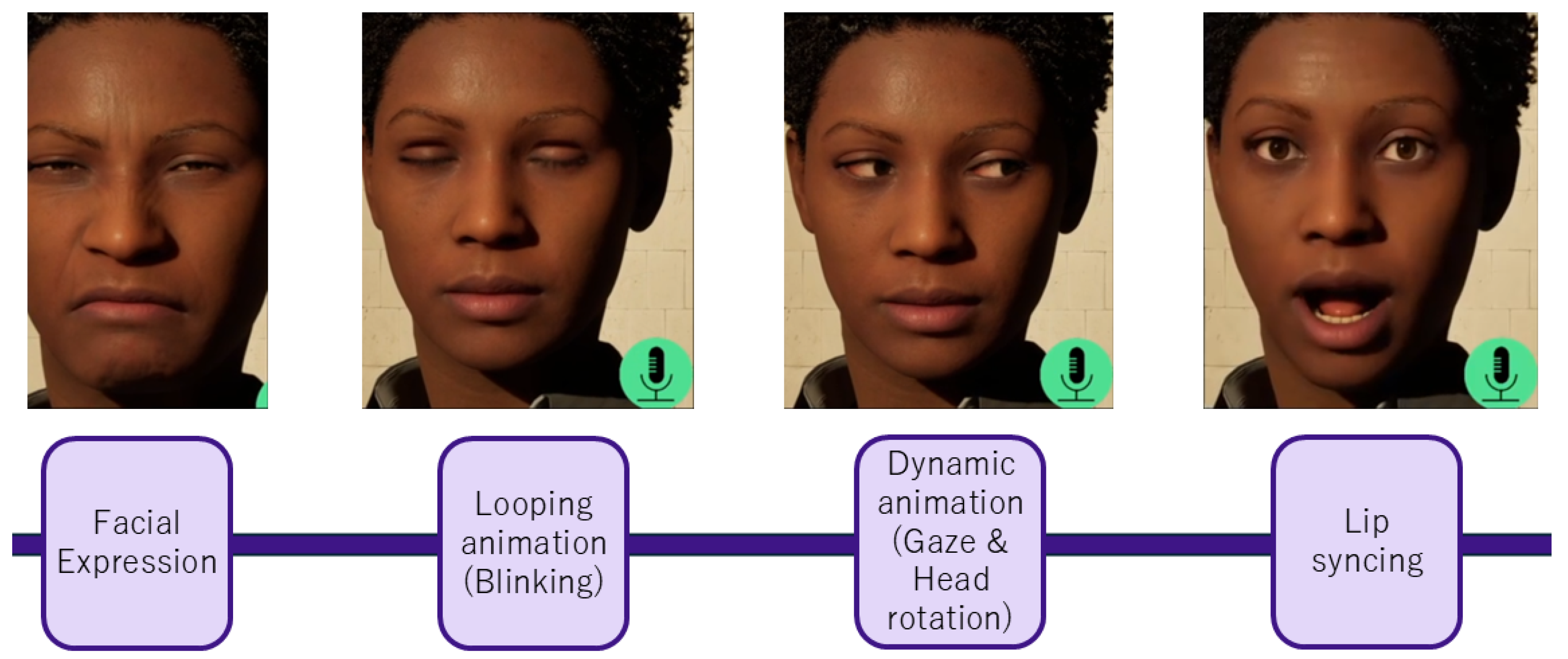 The facial animation is rendered in the Unreal Engine 5 game engine. The animation is subdivided into four blueprints, each taking a specific role. One is the receiver/emitter, which communicates with the Python 3.10 script that controls the other parts of the system. Another takes the user’s input on the screen through the UI. A third blueprint stores all variables of the agent, and the last one handles the animation depending on these variables. The animation is carried out in layers, one after another, as shown in Figure 2. We first obtained the facial expression, the one we selected before. We added some looping animation for blinking, as it made the agent more aware-like and less robotic. We can also control the direction of the gaze and the head. Lastly, we added the lip-syncing animation.