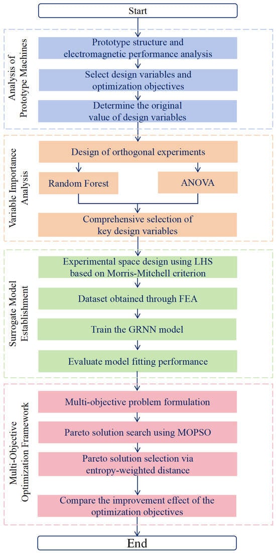 The proposed framework integrates three core components to systematically optimize IPMSM performance. First, a dual-strategy variable importance analysis combining RF and ANOVA is employed to identify key design parameters. RF focuses on the contribution of design variables to the model’s predictions, while ANOVA examines the sensitivity of design variables to optimization objectives, ensuring that the selected variables (flux barrier thickness , PM thickness , and PM width ) possess both predictive utility and high sensitivity. Next, a GRNN surrogate model is constructed using LHS optimized by the Morris–Mitchell criterion. GRNN’s single hyperparameter architecture simplifies training and enhances efficiency under limited samples, achieving high prediction accuracy ( > 0.96). Finally, an MOPSO algorithm generates Pareto-optimal solutions, and an entropy-weighted distance metric objectively selects the final design by quantifying trade-offs between normalized objectives, eliminating reliance on subjective expert judgment.