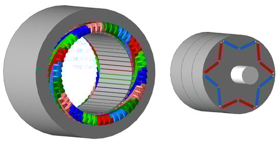This study focuses on a 100 kW IPMSM designed for EV applications. The prototype motor design adopts a 6-pole 54-slot double-layer short-pitch-distributed winding with a coil pitch of 8 to suppress harmonic component while maintaining a relatively high electromotive force (EMF) amplitude. The rotor is featured with a V-shaped interior permanent magnet to concentrate the magnetic field. The main parameters of the prototype machine is shown in Table 1. The 3D model of the motor is shown schematically in Figure 2.