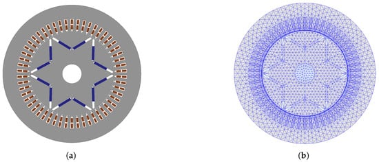 The analysis of the prototype machine is performed by a finite element model (FEM), which is shown in Figure 3a. The mesh arrangement is shown in Figure 3b. The materials in each part of the IPMSM are assigned according to the corresponding entries in Table 1. One section mesh is applied to the solid parts of the IPMSM to better analyze the high-frequency electromagnetic field while the “band region”, which covers the whole rotating area including rotor and air gap, has an in-section mesh to meet the basic requirements of finite element analysis. Due to the need for a special consideration of high-frequency eddy current losses, additional fine mesh is applied to the permanent magnets. The total number of elements eventually reaches 7214.