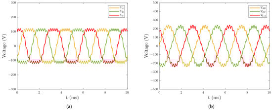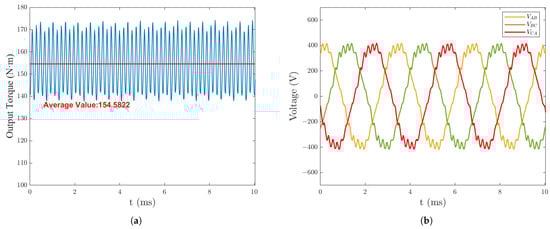 The simulation operating point was selected at the rated speed of 6000 rpm. Under no load, the phase EMF and line EMF waveforms are shown in Figure 4. For the defined loading condition, a 300 A RMS sinusoidal phase current with a 16° current advance angle was implemented as the representative operational scenario. The balanced three-phase excitation with frequency-synchronized 120° phase spacing was applied, resulting in an output torque as depicted in Figure 5a, and the line EMF waveform is shown in Figure 5b. The output power reached approximately 100 kW, and the system efficiency was calculated as 98.05%. (This value is high due to the fact that this finite element analysis only considers iron losses and permanent magnet eddy current losses and does not take into account mechanical losses which are more difficult to quantify.) All finite element results presented hereafter were obtained under this characterized load configuration (300 A RMS, 16° current angle).