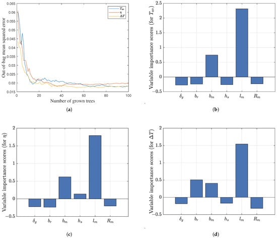 Random forest model evaluation and variable importance scores: (a) MSE convergence of the random forest model; (b) variable importance scores for average output torque; (c) variable importance scores for motor efficiency; and (d) variable importance scores for torque ripple.