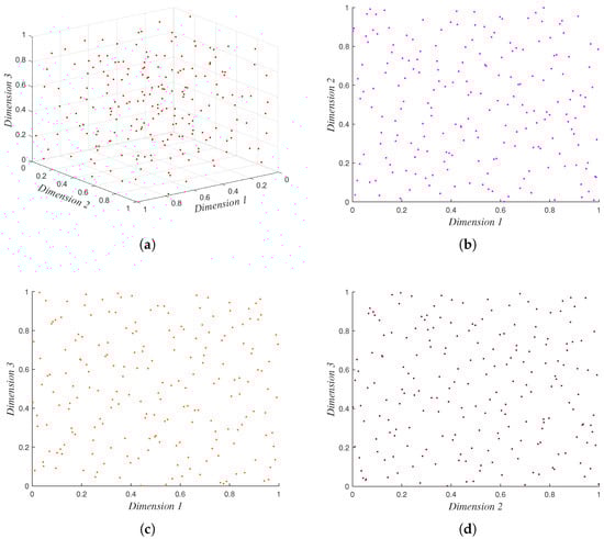 Sampling results of the optimized Latin hypercube design: (a) 3D spatial distribution of experimental points; (b) projection of experimental points on Dimension 1 and Dimension 2; (c) projection of experimental points on Dimension 1 and Dimension 3; and (d) projection of experimental points on Dimension 2 and Dimension 3.
