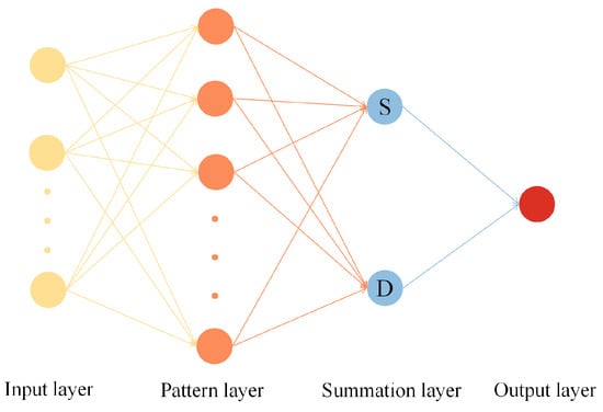 The input layer dimension corresponds to the feature space of training samples. In the pattern layer, each neuron computes the Gaussian-transformed Euclidean distance between the input vector X and the i-th training sample :