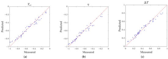 To evaluate the predictive performance of the surrogate model, 200 FEA-derived datasets were utilized to train the GRNN after max–min normalization, ensuring all inputs and outputs were scaled within [0, 1]. As summarized in Table 5, compared to SVR, MLP and Kriging, GRNN demonstrated superior and balanced performance across all optimization objectives under the limited samples, consistently achieving the lowest RMSE values and highest scores. As shown in Figure 11, each subplot presents a scatter plot of predicated versus measured values for a certain optimization objective, with a “” reference line indicating perfect agreement. The data points for , and all closely align with the reference line. The high consistency between predicted and measured values across all three objectives demonstrates the strong predictive accuracy of the GRNN-based surrogate model. Cross-validation further confirmed the model’s generalization capability, with minimal deviations observed across the design space. This comprehensive performance highlights the GRNN’s effectiveness in capturing nonlinear electromagnetic relationships while maintaining computational efficiency, making it particularly suitable for surrogate-assisted optimization in resource-constrained scenarios.