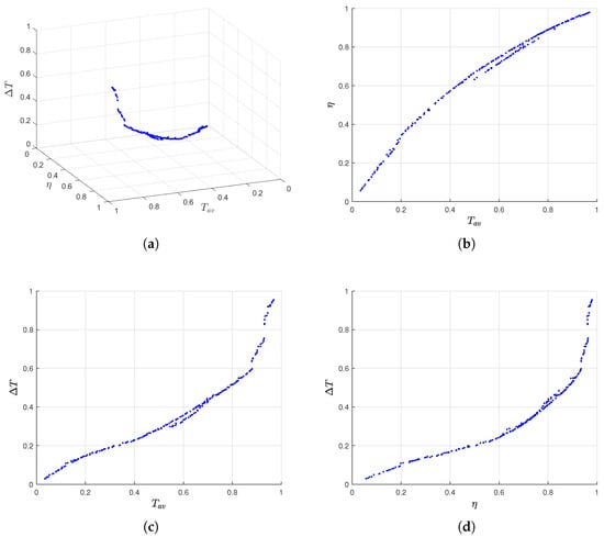 Pareto frontier images: (a) Pareto frontier 3D image; (b) projection of Pareto frontier on and ; (c) projection of Pareto frontier on and ; and (d) projection of Pareto frontier on and .