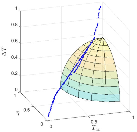 - Entropy-weighted distance evaluation: The composite performance of each Pareto solution was assessed using a weighted Euclidean distance metric:where , and are values of the objectives in Pareto solutions (normalized to [0, 1]). Solutions with smaller values exhibit balanced performance closer to the ideal point = in normalized objective space. Geometrically, this defines an ellipsoid in 3D objective space centered at (Figure 13). The point with the smallest will be chosen as the final Pareto optimal solution.